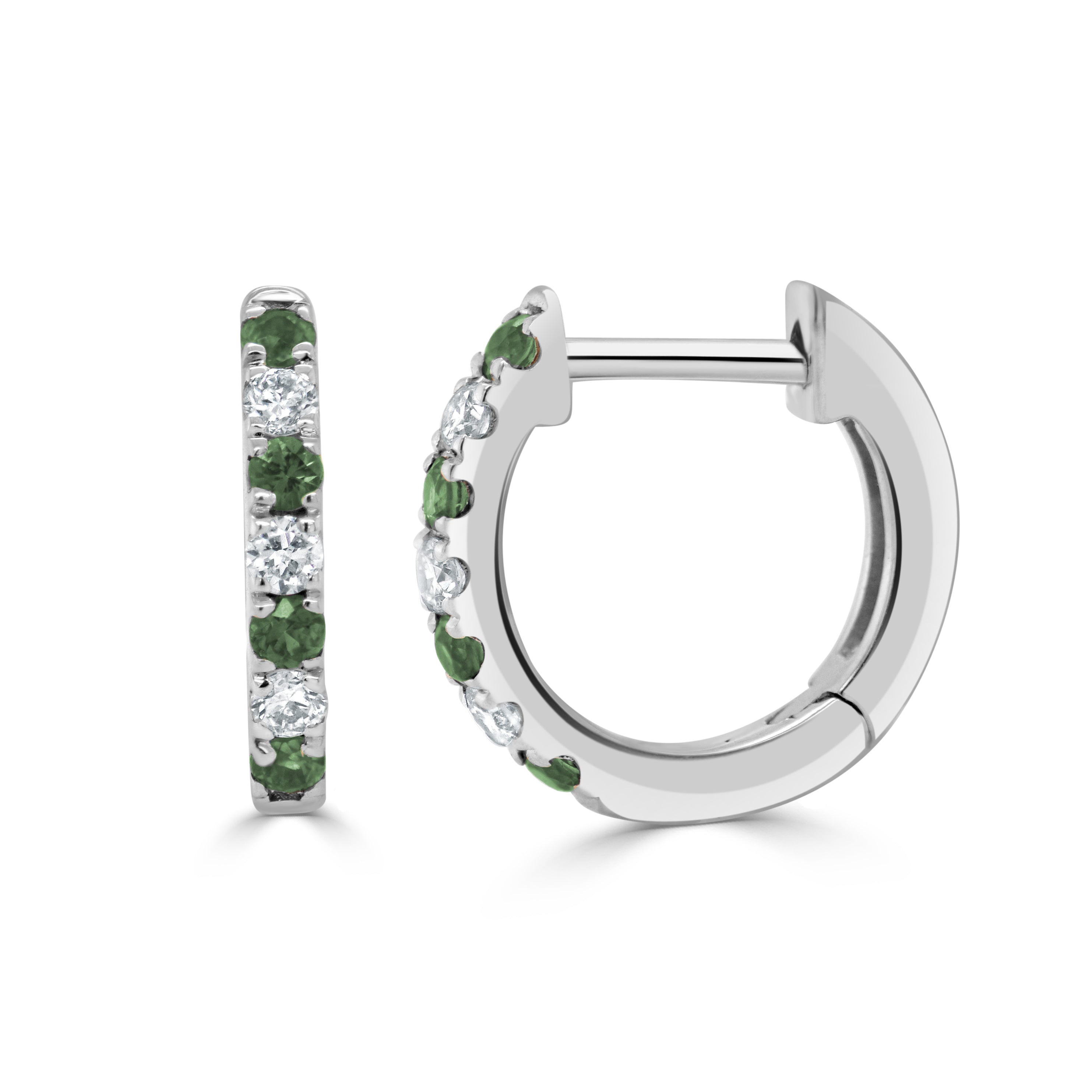 14K EMERALD AND DIAMOND ALTERNATING HUGGIE EARRINGS